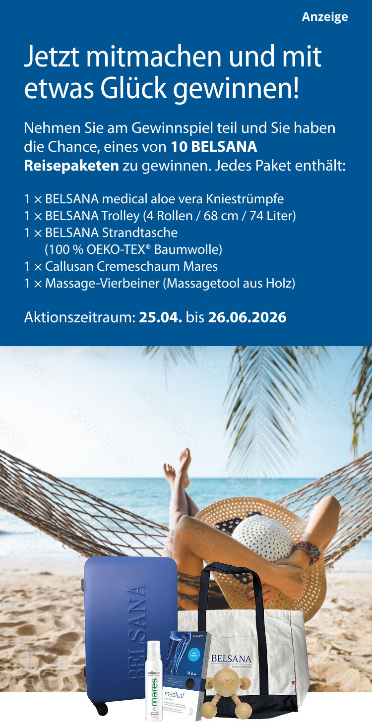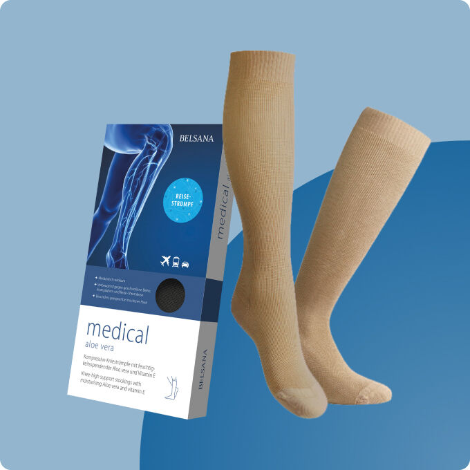 Müde Beine, geschwollene Füße, Besenreiser oder Krampfadern können den Alltag oder eine Reise erschweren und das Wohlbefinden beeinträchtigen. Die kompressiven und medizinisch wirksamen Kniestrümpfe BELSANA medical aloe vera sorgen für mehr Lebensqualität und beugen gleichzeitig Thrombosen vor.